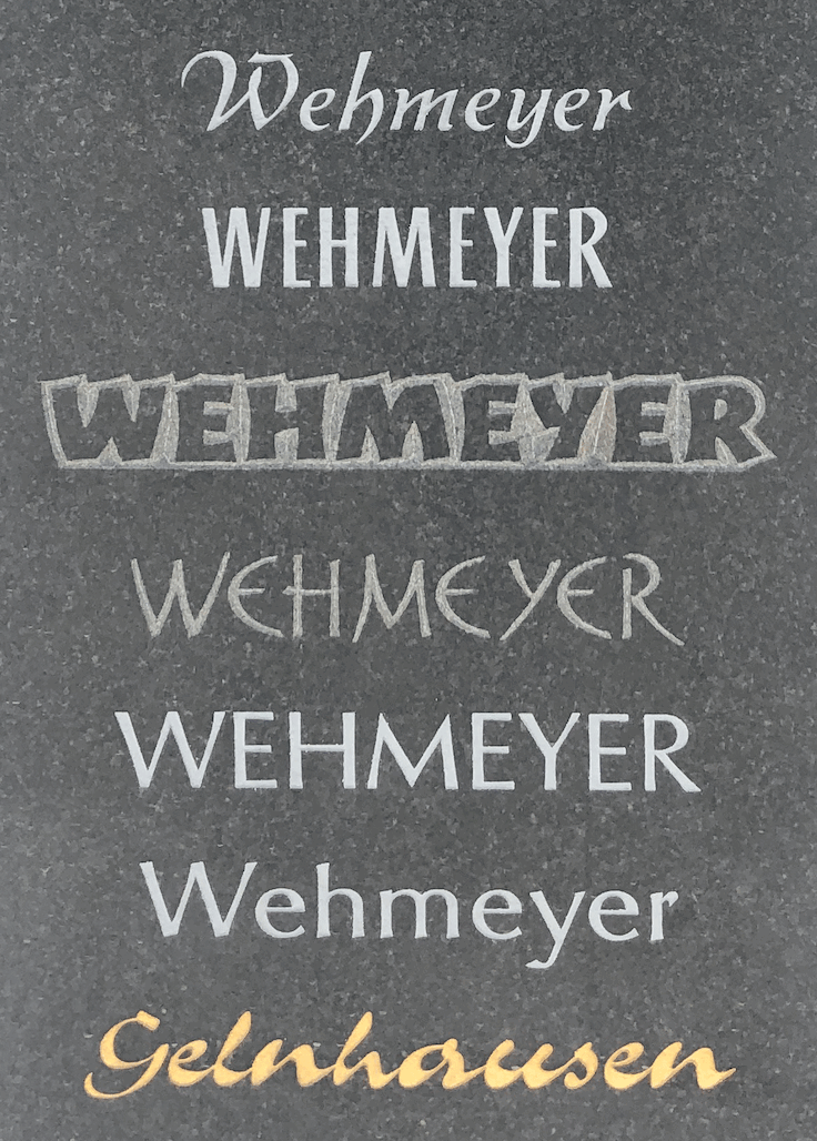 Der Name des Verstorbenen sowie dessen Geburts- und Sterbedaten gehören auf jeden Grabstein. Zusätzlich haben Sie die Möglichkeit, dem Verstorbenen zum Beispiel einen persönlichen Spruch zu widmen und so noch mehr über ihn zu erzählen. Wir bieten Ihnen unterschiedliche Gestaltungsmöglichkeiten für die Inschrift, so dass diese optimal mit dem gewählten Grabstein harmoniert.
